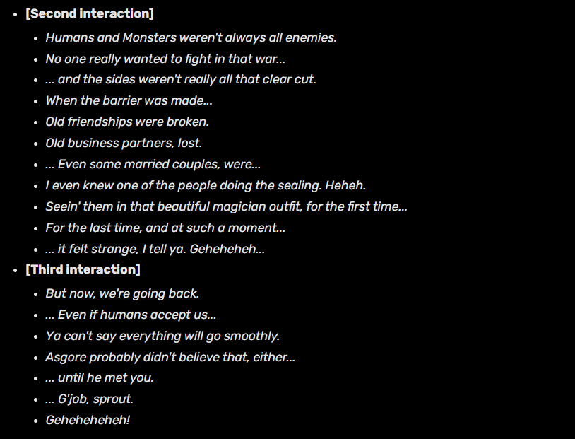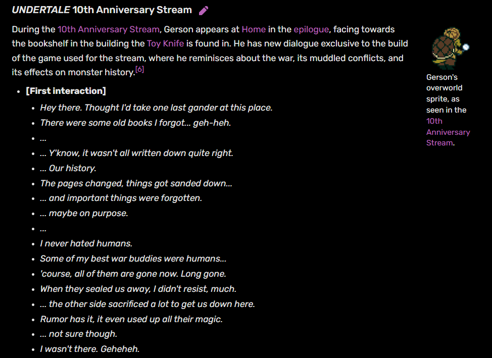 In questo stream, Toby e amici hanno giocato ad una versione segretamente modificata del gioco che conteneva robe molto strane e nuove, uno sprite di Noelle bambina nascosto dietro l'albero di Natale facendo finta non sia lì, il corridoio di Gaster dove al posto della porta grigia vi è una porta normale (di nuovo, fanno finta di nulla) etc. Se vuoi andartele a spulciare, puoi facilmente trovare tutte le differenze raccolte in vari video, ma le due su cui mi vorrei concentrare sono un nuovo dialogo di Gerson che dà più contesto alla Guerra fra Mostri e Umani...